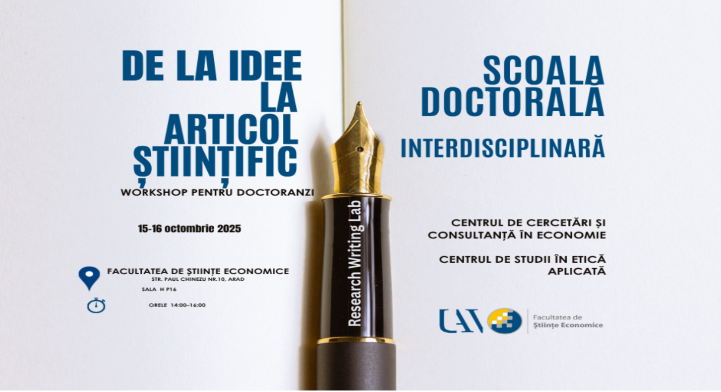 Școala Doctorală Interdisciplinară – Domeniul de doctorat Management a organizat, în perioada 15–16 octombrie 2025, workshopul dedicat doctoranzilor intitulat „Research Writing Lab 2025 – De la idee la articol științific”. Evenimentul organizat în colaborare cu Centrul de Cercetare și Consultanță în Economie și Centrul de Studii în Etică Aplicată, le-a oferit doctoranzilor oportunitatea de a-și dezvolta competențele de redactare academică, ghidându-i de la formularea ideii de cercetare până la publicarea unui articol științific. La acest eveniment, Centrul de Studii în Etică Aplicată a fost partener, contribuind activ la promovarea principiilor etice în cercetarea științifică și la consolidarea unei culturi a integrității academice în rândul tinerilor cercetători.