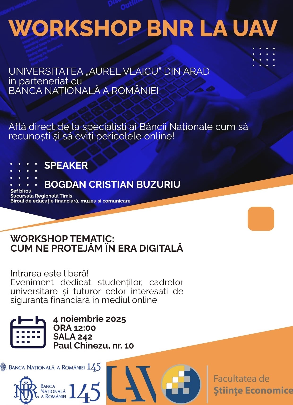 11/4/2025Universitatea „Aurel Vlaicu” din Arad, în parteneriat cu Banca Națională a României, a organizat un workshop interactiv dedicat siguranței financiare în mediul online. Invitatul special, Bogdan Cristian Buzuriu, șef birou la Sucursala Regională Timiș – Biroul de educație financiară, muzeu și comunicare, a oferit participanților informații valoroase despre cum să recunoaștem și să evităm pericolele din spațiul digital.